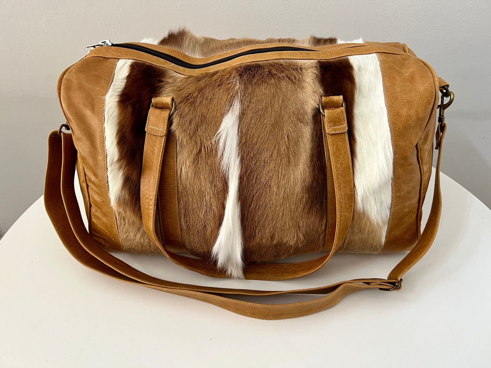 This is a top quality, brand new duffel/overnight bag professionally made from genuine Springbok skin and genuine leather. This attractive item is a real statement piece.