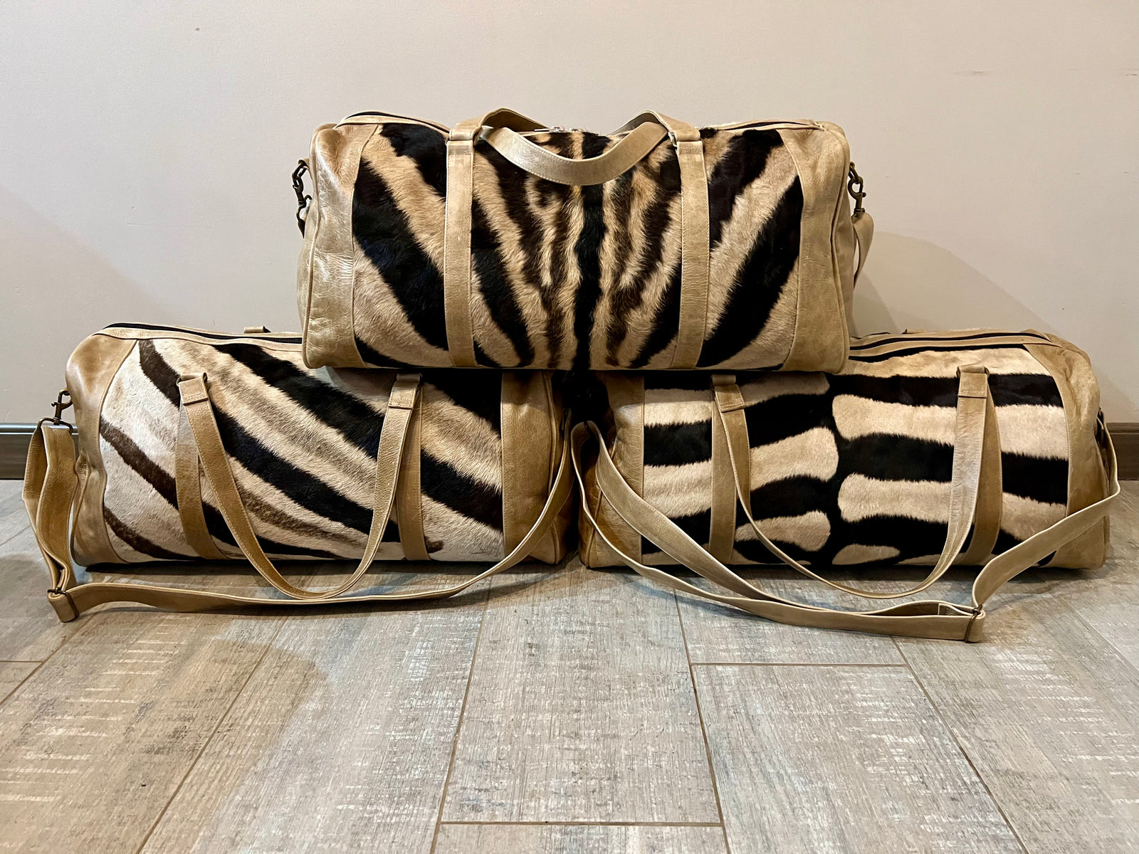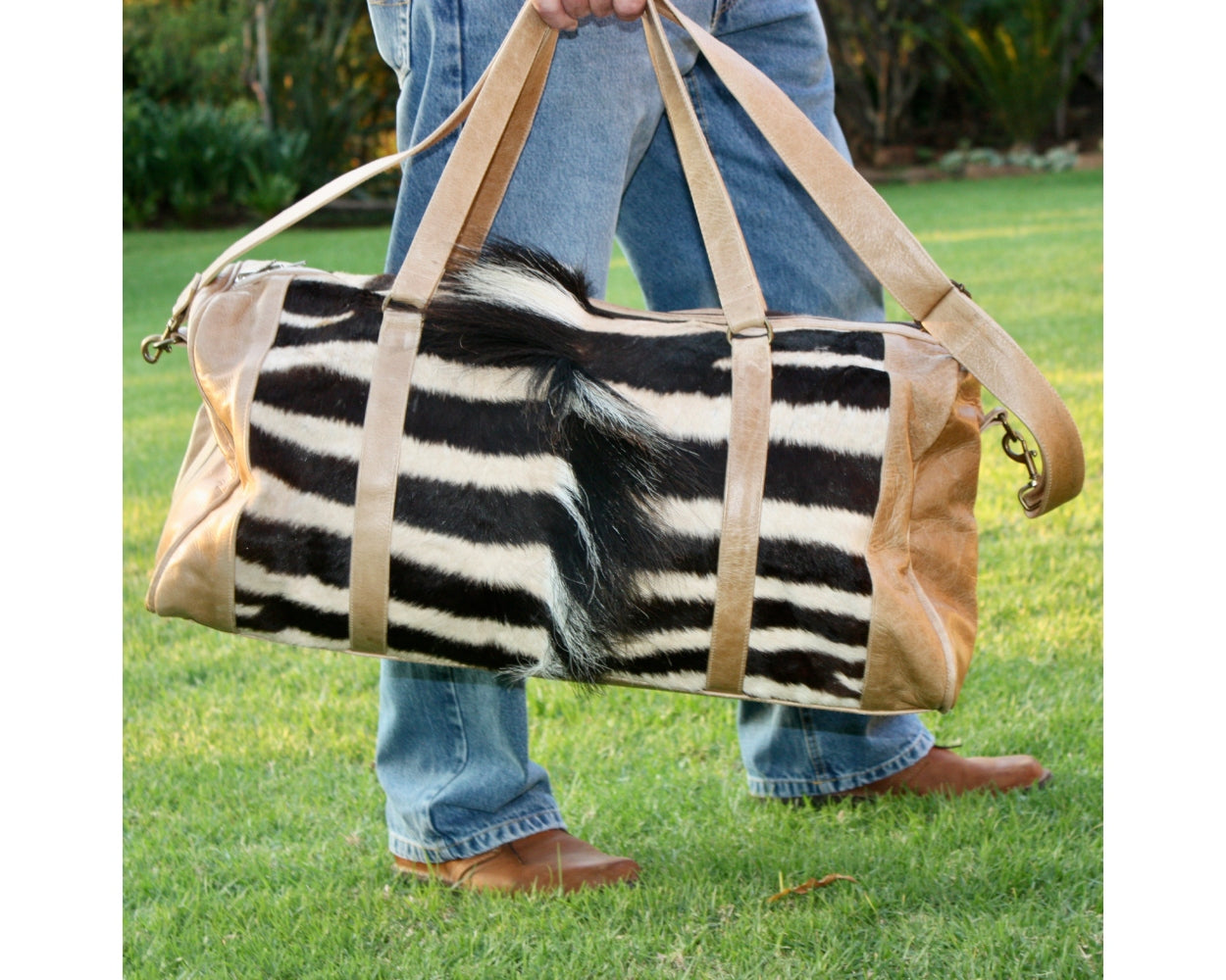 This is a top quality, brand new duffel/overnight bag professionally made from genuine Zebra skin and genuine leather. This attractive item is a real statement piece.
